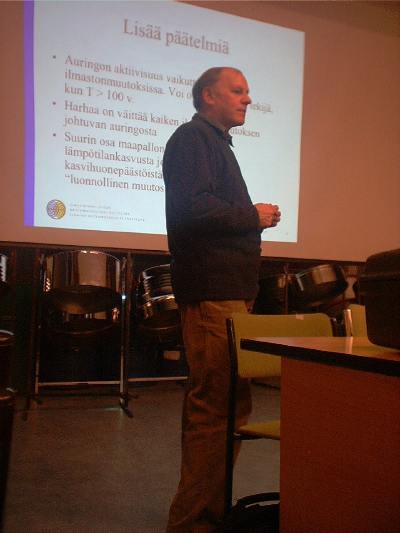 Esitelmässä tarkasteltiin kysymystä siitä, kuinka paljon Auringon aktiivisuus vaikuttaa maapallon sää- ja ilmasto-oloihin eri pituisina aikoina auringonpilkkujaksosta eteenpäin.