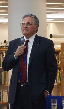 Kuumies Harrison Schmitt esitelmöi Pasilan kirjastossa. Kuva Seppo Linnaluoto.