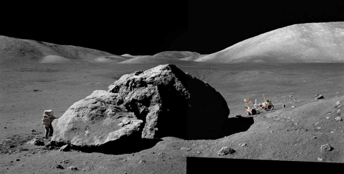 Apollo 17 -lennolta. Harrison Schmitt seisoo kivenlohkareen vasemmalla puolella,