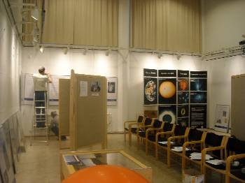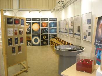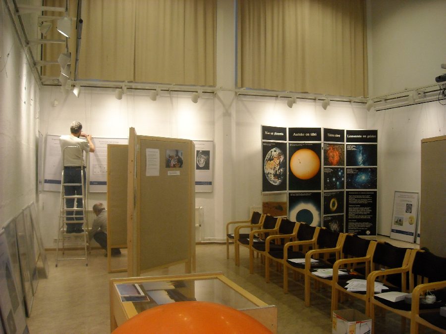Vasemmalla Seppo Ritamäen tähtikuvia, takana tähtitieteen perusteiden näyttelytaulut, seinällä tähtitieteen historian näyttelytauluja, pöytäplanisfääri ja edessä oikealla Ursan meteoriittikokoelma.