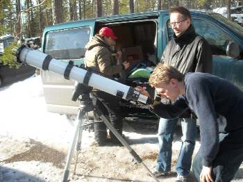 Toni Veikkolainen katsoo Petri Kehusmaan (takana) aurinkokaukoputkella.