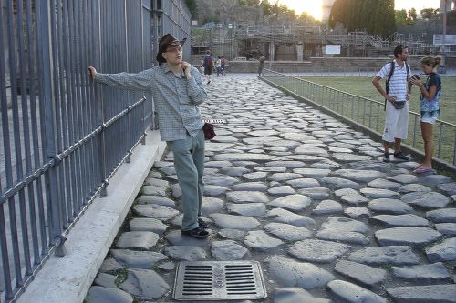 Ville Marttila vanhalla roomalaisella tiellä. Sadevesikaivo on myöhemmän