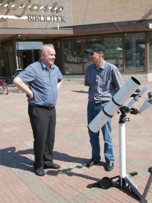 Komeetta torilla kirjaston edessä. Oikealla Heikki Marttila. Kuva Hannu