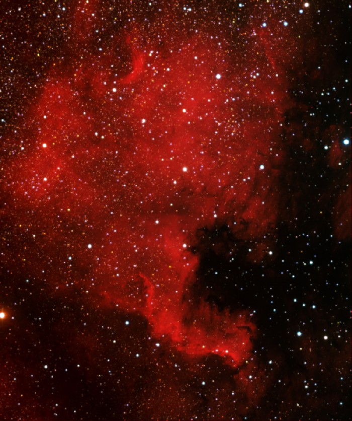 Pohjois-Amerikka-sumu NGC7000. Kuvattu Nummi-Pusulassa 200 mm f/2.8 teleobjektiivilla ja Atikin CCD-kameralla. Valotus filttereillä yhteensä 1 h 40 min. Kuvaaja Antti Kuosmanen.
