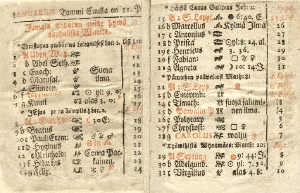 Ensimmäinen suomenkielinen almanakan aukeama vuodelta 1705. Huomaa että