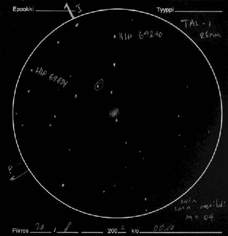 Piirroshavainto klo 17:50 Evitskogissa. Havaintoväline M110/805, 32x. Koman DC 7, halkaisija n. 6'. Kirkkaus puuttuu.