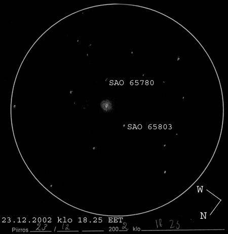 Havainto klo 18:50 Evitskogissa. Havaintoväline M110/805, 32x. Mag n. 6.4 (In-Out). Koman DC 7, halkaisija 9'. Pyrstö 25' PA 54.