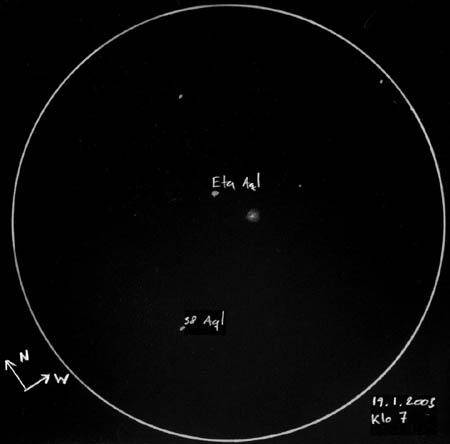 Komeetta löytyi varsin mukavasti Eta Aquilan vierestä. Samantyylinen keskelle kirkastuva utupallo kuin aiemmin. Oli suunnilleen saman kirkkauksineen kuin tähti 58 Aql In-Out -menetelmällä, eli oli taas kirkastunut. Pyrstöä en erottanut.