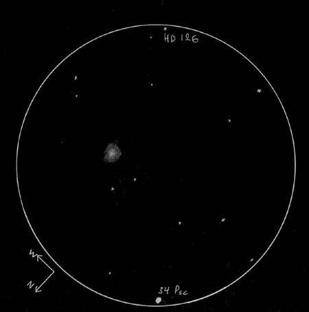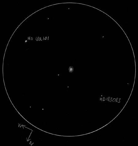 Piirroshavainto klo 18:50 Evitskogissa. Havaintoväline M110/805, 32x. Koman DC 2, halkaisija n. 10'. Kirkkaushavaintoa ei yritetty.