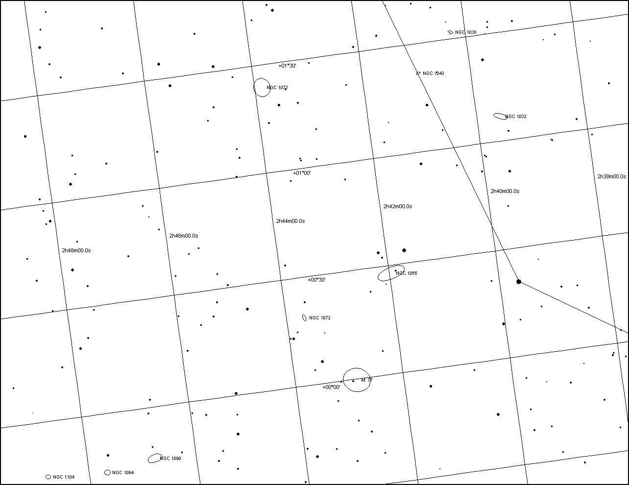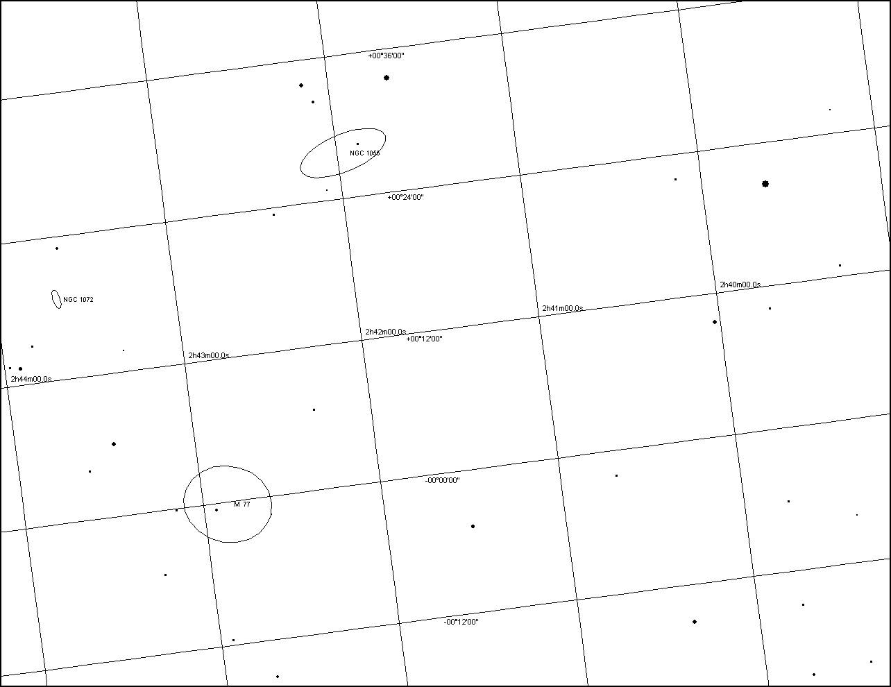 Jäljellä olevista kahdestakymmenestäneljästä messierkohteesta Suomesta näkyy vielä kohtuullisesti kolme: M46, M77 ja M78. Päätin ensimmäiseksi etsiä tuon galaksin M77/NGC1068 Valaan tähdistöstä. Kirjojen mukaan M77 on Seyfertin galaksi eli sen ytimessä on poikkeuksellista aktiivisuutta. Sen keskustasta suihkuaa kuulemma kaasua ällistyttävällä nopeudella. Havainnoin M77n Kolsarissa 29.10.02 noin klo 23. Keli oli kyllä ihan kelvollinen, mutta kohde oli melko matalalla, joten jouduin katsomaan sen käytän nössä kahden katulampun välistä! Käytin 20mm okulaaria joka antaa 114-kertaisen suurennoksen. Alla etsintäkartat.