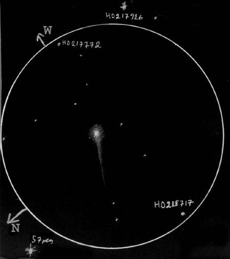 Komeetta löytyi varsin helposti ja se olikin kirkastunut huomattavasti sitten viime näkemän. Komeetan keskus oli kirkas ja melkein kiekkomainen. Keskuksesta koma himmeni hyvin nopeasti näkymättömiin, jättäen koman koon itse asiassa pienemmäksi kuin aikaisimmilla havainnoilla. Voi olla, että komeetan himmeämpiä osia jäi taustataivaan vaaleuden peittämäksi. Jotain aavistusta komeetan pyrstöstä taisin saada.
