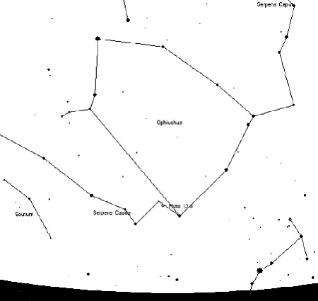 Taivas Käärmeenkantajan suuntaan 4.4 klo 4. Pluto on kuvion alaosassa.