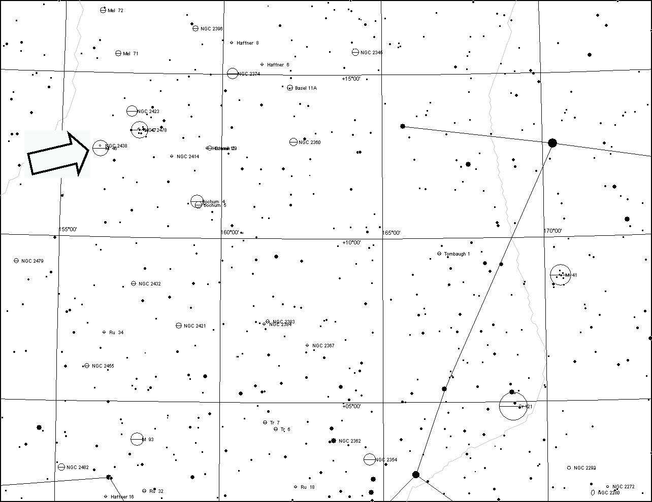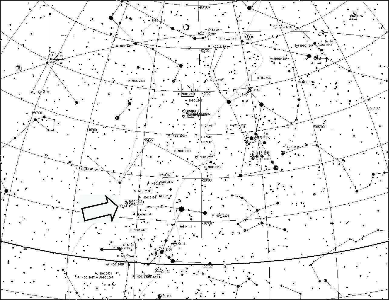 M46 havaintokortti. Huomaa himmeä planetaarinen sumu.