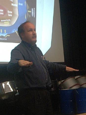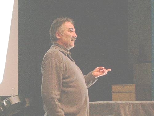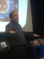 Dosentti Tapio Markkanen esitelmöi Kirkkonummella.