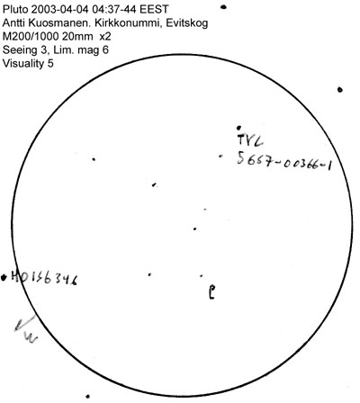 3/4.4.2003Torstain puoliltaöin - perjantai aamuun näytti ennusteiden mukaan olevan selkeää ennen myrskyn tuloa, joten lauantai-aamuksi suun nittelema sessioni aikaistui vuorokaudella. Projektin nimi oli Pluton haku. 20cm putki sanotaan vähimmäisvaatimukseksi Pluton näke miselle, joten pitäähän sitä koittaa.