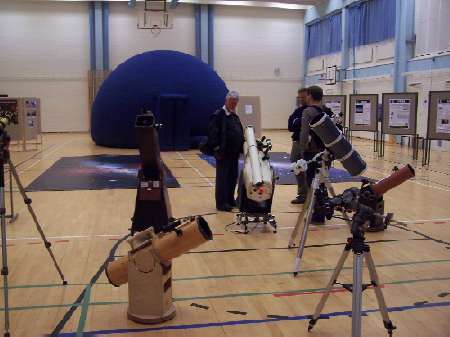 Näyttely liikuntasalissa. Edessä kaukoputkia, takana Ursan planetaario.