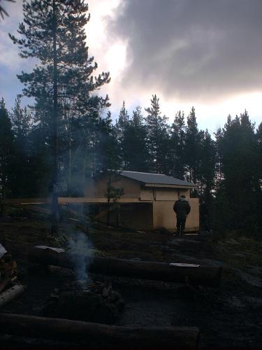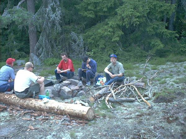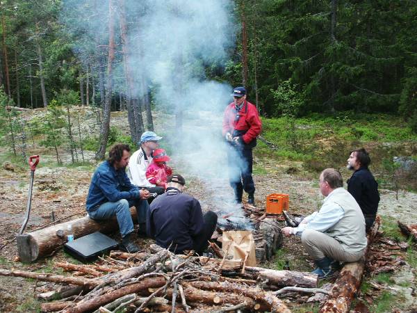 Savuttavan nuotion ääressä istuvat vasemmalta Kaj Wikstedt, Mikko