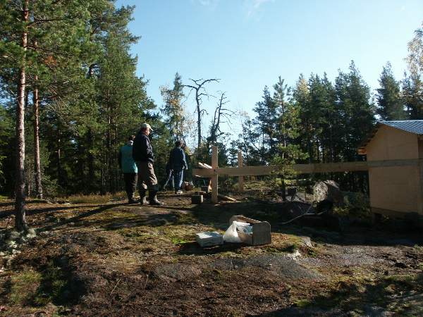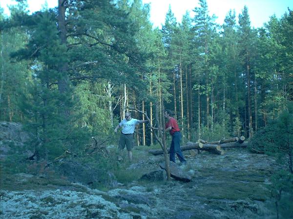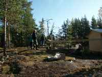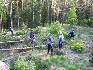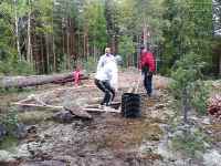 Ensimmäinen tehtävä oli metsän raivaus. Vasemmalta Janne