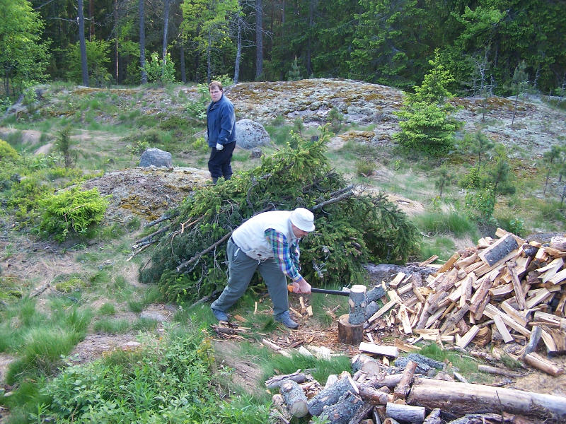 Kai Nyman hakkaa puita ja Antti Kuosmanen katselee. Kuva Seppo