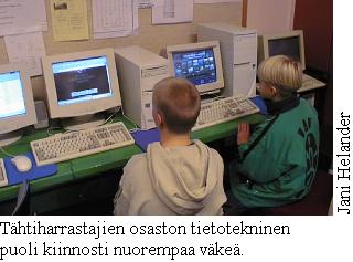 Itse koululla oli vuorossa vieraiden kahvitus, josta vastasivat maineikkat Ryttylän Martat. Koululla esittäytyivät myös tornin rakentamiseen osallistuneet harrastusyhdistykset, joista Kanta-Hämeen Lintutieteellinen yhdistys esitteli linnunpönttöjä ja raotti ornitologian saloja vieraille. Lisäksi lintumiesten mieltä varmasti lämmitti tornin ympäristöön rakennettava luontopolku. Toista luonnontieteen haaraa edusti tietenkin oma yhdistyksemme. Paikallisten tähtiharrastajien osaston tiiminä toimi Markku, Jorma, Jari Sankala sekä allekirjoittanut oli majoittunut koululuokkaan, jossa esillä oli JS-Dobsonin lisäksi edellisen päivän näyttelyn kuva- ja esittelymateriaalia. Kirjoittajan hikisen puurtamisen tuloksena pyöri luokan tietokoneissa Tähtien Takaa -cd romppu, yhdistyksen kotisivut sekä kuvia Piiritornin rakennusvaiheista. Suurinta mielenkintoa ihmisissä herätti reaaliaikaiset kuvat avajaisista, jonka digitaalitekniikka mahdollisti. Digitaalinen aikakausi oli siis saapunut Hausjärvellekin.