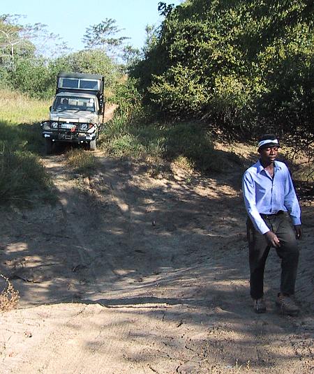 Jo ennen puistoon saapumistamme kohtasimme ensimmäisen villieläimemme; tiellä automme edessä oli kameleontti! Apupoika Victor nappasi otuksen kiinni ja antoi sen meille lähempää tarkkailua varten. Otuksen silmät kääntyilivät villisti ja se liikkui hitaasti ja äärimmäisen vakaasti. Vaikkei otuksen pitänyt purra, niin Markku sai pienen verinaarmun kameleontin iskiessä sihisten 'hampaansa' kiinni sormeen. Laskimme sen vapauteen tienvarren puuhun. Puiston portin jälkeen maisema muuttui ruohikkoisemmaksi, väliin ruohikko oli jopa kolmimetristä. Näimme joitain lintuja ja lähestyessämme leiriä myös muutaman antiloopin ja pienen paviaaniperheen. Tie oli etukäteisilmoituksen mukainen: "Some bad and some VERY bad road!". Ainoastaan nelivedolla saimme ylitettyä kaksi joenuomaa, sadekaudella tietä ei todellakaan olisi voinut kulkea.