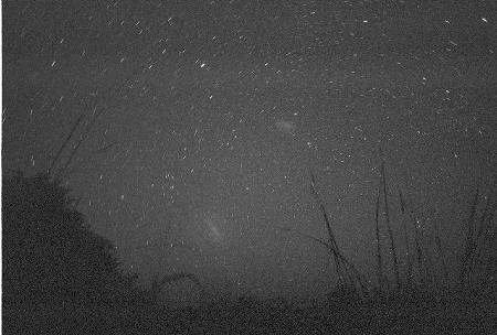 Aamulla Jorma tuli herättämään kello 4.30. Etsimme komeetta C/2001 A2 Linearin Eridanuksen ja Valaan tähdistöjen välimaastosta. Se löytyi aika helposti, kun tähtikuviot oli ensin hahmotettu. Pyrstötähti näkyi 3 magnitudin tähtenä paljainsilmin, mutta kiikarilla se erottui pintakohteeksi, kuin suuri pallomainen tähtijoukko. Pyrstö näkyi vain hieman isommilla kiikareilla ja silloinkin kapeana viiruna. Pienempi Magellanin pilvistä näkyi hyvin elelätaivaalla. Hain kameran ja otin kuvia komeetasta ja Magellanin pilvistä. Yhteen kuvaan tarttui kirkas tähdenlentokin, niitä näkyi aamun aikana useita. Leijonat tulivat koko ajan lähemmäs ja lopulta niiden murina oli niin voimakasta, että alkoi jo hirvittämään, ne eivät voineet olla kovinkaan kaukana pimeydessä. Ei tosin nähty kiiluvia silmiä, vaikka taskulampulla murinan suuntaan osoittelimmekin. Onneksi ei nähtykään! Virittelimme nuotion uudelleen tuleen ja joimme termarista aamuteet odotellen auringonnousua. Jotenkin hereillä olijat kerääntyivät tulen ääreen leijonien liikuskellessa lähimaastossa.