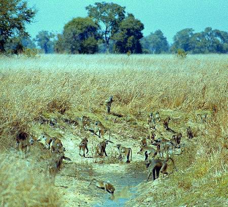 Seuraavaksi näimme pahkasikoja ja sitten paviaaneja. Tien yli tuli ensin pari tiedustelijaa ja sitten koko joukko äitipaviaaneja pikkuisten selässä ratsastavien poikasten kanssa, loppujoukko oli taas suurempien urosten muodostama. Joukko meni pienelle lammikolle juomaan ja saimme seurata niiden eloa kiikareilla ja taisipa tulla hyviä kuviakin. Lauman käyttäytyminen vaikutti suunnitellulta ja kaikki tapahtui hyvässä järjestyksessä. Yksi matkan monista hienoista luontokokemuksista tämäkin. Jonkin matkan päässä huomasimme suuren kotkan apinanleipäpuun latvassa. Se oli komea ilmestys ja saimme hienoja kuvia sen lentoonlähdöstä. Markku pongasi ilmiömäisesti lintuja: mehiläissyöjiä, haukkoja, kotkia, loistonärhiä ja papukaijoja!