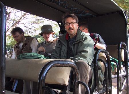 Auringon laskettua pimeä laskeutui nopeasti ja siirryimme valonheittimen käyttöön. Valonheittimellä ei tuntunut ensin löytyvän mitään, mutta sitten näimme kiiluvia silmiä: antilooppeja! Vähän myöhemmin kudu-antilooppi aivan lähellä. Videokameroilla sai hyvää kuvaa valonheittimen valossakin. Sitten huomasimme kiiluvat silmät tien vasemmalla puolella, pieni kissa. Se oli pienipäinen ja isokorvainen täplikäs otus. Saimme seurata sitä muutaman minuutin, ennenkuin se loikkasi näkymättömiin. Valonheittäjän akku alkoi jo hyytyä, mutta onneksi Jämsän pariskunnalla oli omatkin taskulamput mukana ja kohta pusikossa oli taas kiiluva silmäpari: toinen kissa, nyt suurempi ja yksivärinen. Vain muutamassa minuutissa olimme nähneet kaksi kissapetoa, uskomatonta tuuria. Olimme jo melkein teltoilla kun Markun taskulampun valokeilassa oli suuremmat ja kirkkaammat silmät, kuin kaksi smaragdinvihreää lamppua! Suurempi kissa, leijona? Ei vaan leopardi!! Lottovoitto! Kaikkein vaikeimmin nähtävä eläin koko puistossa. Leopardi istui parinkymmenen metrin päässä tiestä ja katseli meitä rauhallisena. Toivottavasti videokuvaajien kädet eivät tärisseet paljon, jotta kuvaa tuli varmasti talteen. Pitkältä tuntuneen hetken jälkeen leopardi poistui näkyvistä. Huh huh, olipa hieno lopetus ajelulle. Joe ei ollut uskoa että näimme todellakin kolme kissaa, mutta kaikki oli vidolla tunnistettavissa! Pienin kissa oli servaali, keskikokoinen aavikkoilves ja suurin oli kuin olikin leopardi!
