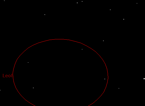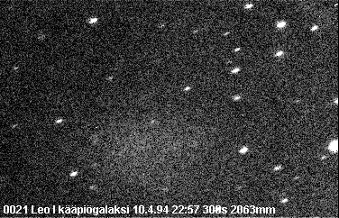 Kääpiögalaksi Leo I Leijonan tähdistössä kuuluu paikalliseen galaksiryhmään. Se on vain vajaan puoli astetta Reguluksen pohjoispuolella. Galaksilla on erittäin pieni pintakirkkaus, mika tekee siitä lähes mahdottoman havaintokohteen. Tässä ccd-kuvassakin se nakyy vain epämääräisenä kirkastumana kuvan alaosassa. Kuvattu Rihlaperän tähtitornilla 10.4.94 kello 22:57.