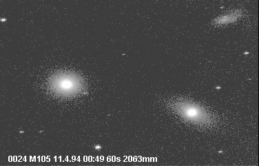 Vasemmalla m105 ja oikealla alhaalla ngc 3384 ja ylhäällä ngc 3389. Galaksit kuvattiin Rihlaperän tähtitornissa 11.4.94 kello 00:49. Valotusaika 60s, ST-6 ccd ja 150/2063mm linssiputki.