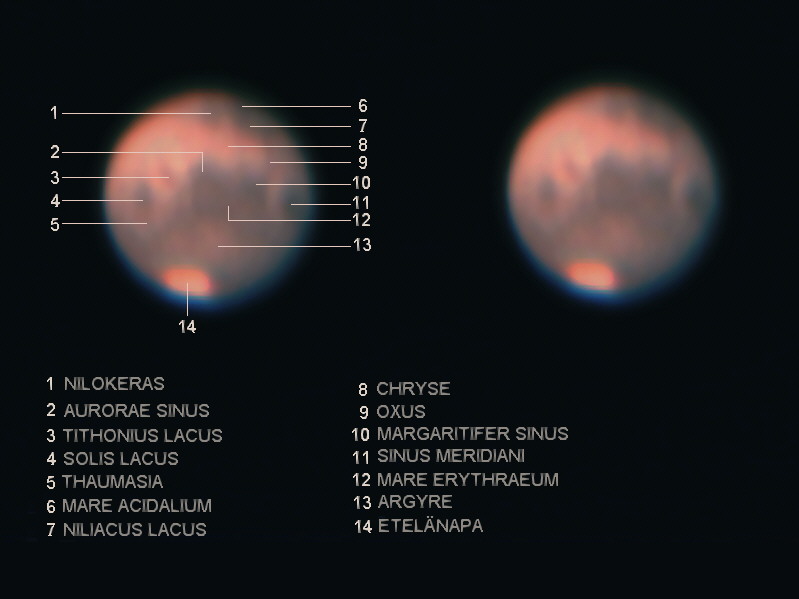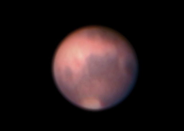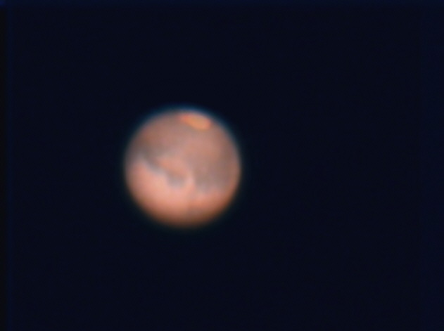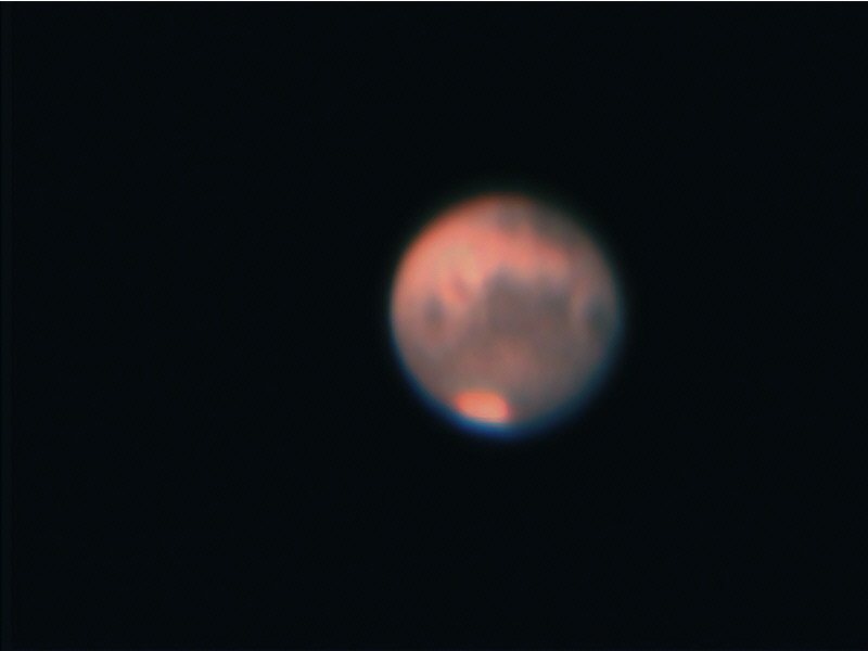 Arto Oksanen ja Petri Tikkanen: Nyrölässä Meade LX200 ja ST8XE. Mars on liian kirkas, kokeilemme seuraavaksi ST5 kameraa, jolla päästään 0,001 sekunnin valotuksiin. Tässä kuvassa käytettiin vihreää suodinta 0,01s valotuksella. Punaisella saisi eniten yksityiskohtia esiin, mutta ST8:lle Mars on liian kirkas!
