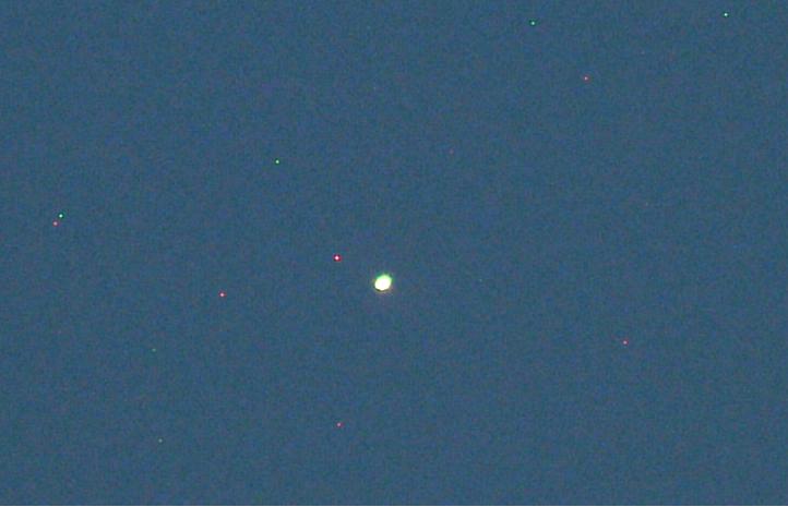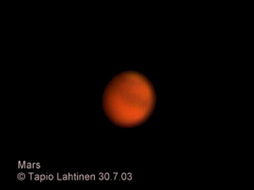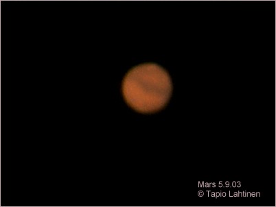 Risto Pasanen: "Mars on siinä reilusti ylivalottuneena, koska muuten siihen en olisi saanut noita muita tähtiä ollenkaan näkyviin. " Kuva otettu 31.7.2003 kello 0.26. Valotusaika 3 sekunttia, aukko 2,8 ja herkkyys 160. Fujifilm S602 Zoom Digitaalikamera.