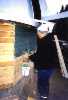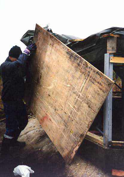 Nyrölän koulun lahjoittamat raakalaudat höylättiin seinälaudoiksi ja ne asennettiin eräänä kylmänä, tuulisena ja lopulta räntäsateisena lauantaina paikoilleen.