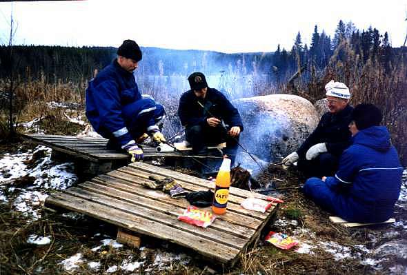 Tauolla paistettiin makkaraa hukkapaloista tehdyllä nuotiolla. Hyvää oli!