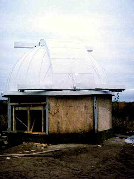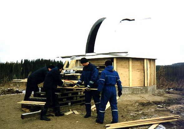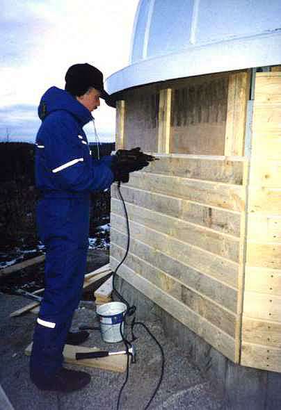 Tässä vaiheessa rakennus alkoi jo uhkaavasti muistuttamaan tähtitornia! Yksi seinä jätettiin auki, jotta sisätöitä päästiin tekemään.
