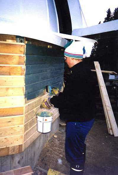 Heti lautojen ollessa seinässä Marko käsitteli ne valtilla. Väri on Jäämeri, ja lämpötila oli juuri sen mukainen maalaushetkellä.
