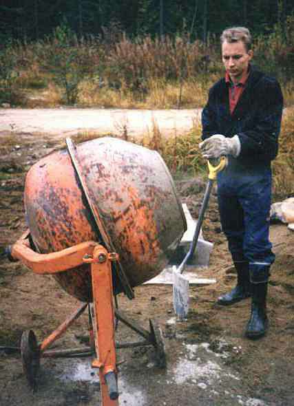 Aluksi yritimme valmistaa betonia kottikärryssä, mutta totesimme homman sujuvan helpommi betonimyllyllä.