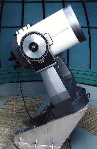 KäyttöEnsimmäiseksi kaukoputki on suunnattava johonkin tunnettuun kohteeseen. Karkea suuntaus onnistuu helpoiten valitsemalla joku tähti oheisesta suuntaustähtiluettelosta ja ajamalla putki siihen. Esimerkiksi Sirius löytyy luettelosta numerolla 67. Putken ohjaus tapahtuu seuraavasti: paina käsiohjaimen STAR näppäintä (6), jonka jälkeen tähden numero 6, 9 ja sitten [ENTER] näppäintä ja vielä [GOTO] -näppäintä, jolloin putki lähtee kääntymään kohti Siriusta. Jos putki lähtee väärään suuntaan tai uhkaa törmätä johonkin, paina [GOTO] -näppäintä uudelleen, jolloin ajo keskeytyy. Ajon päätyttyä kohdista kohde kuvakentän keskelle ja paina [ENTER] -näppäintä noin sekunnin ajan, kunnes ruutuun tulee teksti "Coordinates Matched". Nyt koordinaatisto on asetettu kohdalleen ja seuraavat kohteet löytyvät automaattisesti. Vaihtoehtoisesti voit kääntää putken ensimmäiseen kohteeseen käsin moottoreilla, valita kohteen sen jälkeen kohdeluettelosta ja pitää sen jälkeen ENTER-näppäintä pohjassa kunnes koordinaatit asettuvat.Muista suunnata samalla myös etsinputki kohti perustähteä! Kääntäessäsi kaukoputkea tarkkaile putkesta roikkuvia johtoja ja pysäytä ajo jos johdot kiristyvät. Tämä on erityisen tärkeää CCD-kuvauksessa, jolloin johtoja on paljon. Älä koskaan käännä putkea tietokoneella huoltorakennuksesta, kuin aivan lyhyitä matkoja, ilman että joku on valvomassa johtoja. Kaukoputken ajon voi pysäyttää Goto-näppäimellä, vaikka ajo olisi käynnistetty tietokoneesta. Mikäli kohteesi ovat suunnilleen samalla alueella taivasta, kannattaa koordinaatit 'synkata' jokaisen kohteen kohdalla. Jos kohde on himmeä, eikä löydy helposti, niin kannattaa ensin etsiä joku kirkas tähti läheltä kohdetta ja ajaa ensin siihen, keskittää, synkata ja kääntää vasta sitten himmeään kohteeseen.