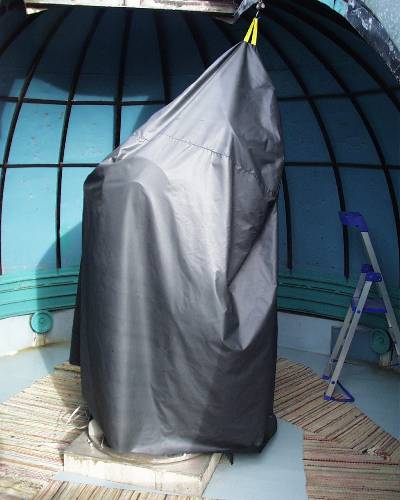SammutusKäännä kaukoputki etelään ja deklinaatioon 0 astetta, jotta käynnistettäessä peruskoordinaatit osuvat suurinpiirtein kohdalleen. Sammuta ensin virta kaukoputkesta kääntämällä virtakytkin Off-asentoon. Tämän jälkeen sammuta vielä virta jalustan virtakykimestä ja irroita käsiohjain sekä okulaari ja kulmaprisma. Tarvikkeet säilytetään huoltorakennuksessa alumiinisalkussa.Peitä putki huolellisesti, jotta mahdollisesti kuvusta vuotava vesi ei pääse kastelemaan kaukoputkea. Mikäli on odotettavissa kosteaa säätä, jätä lämmitin päälle. Muista sammuttaa tornirakennuksen virrat huoltorakennuksen seinän virtakykimestä, ellei lämmitintä tarvita. Jos jätät virran päälle, varmista vielä kerran, että kaukoputki on pois päältä. Jos kaukoputki jää päälle, se 'kuristaa' itsensä deklinaation virtajohtoon ja moottorit voivat vaurioitua.