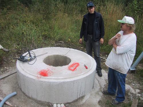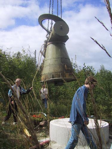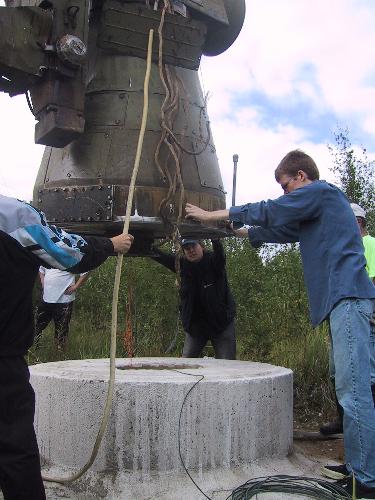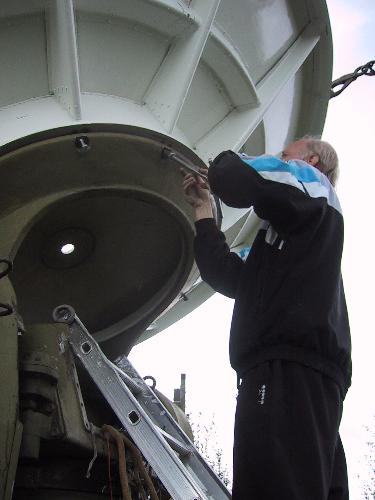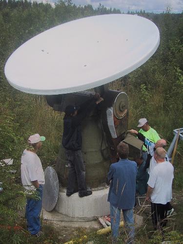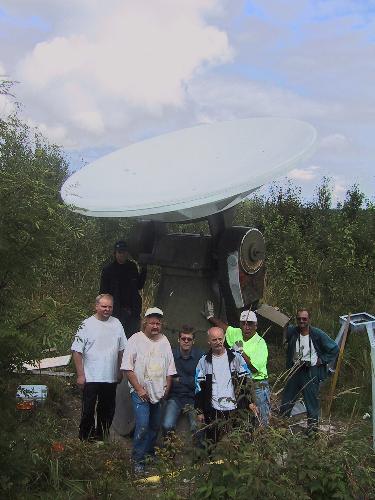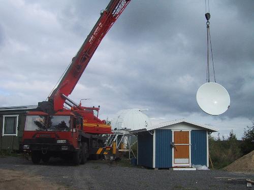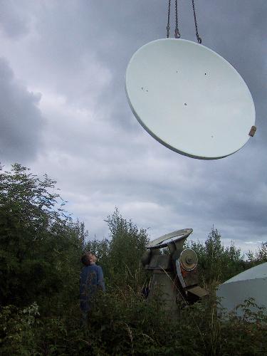 Radioteleskooppi pystytettiin lauantaitalkoissa 16.8.2003. Alusta muotoiltiin teleskoopin pohjan mukaiseksia ja enää vetonarujen pujotus oli tekemättä.