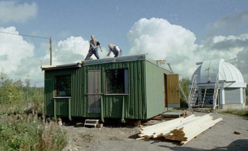 Kuva: Arto Oksanen Nyrölän tähtitornin uusi huoltorakennus on valmistunut kokonaisuudessaan vanhemman viereen. Syksyllä järjestetyissä talkoissa toinen työmaaparakki kunnostettiin tähtitornin uudeksi oleskelutilaksi ja vanha puoli on nyt pelkästään työtilana. Ylläolevassa kuvassa on aloitettu molempia rakennuksia suojaavan yhteiskaton rakentaminen.