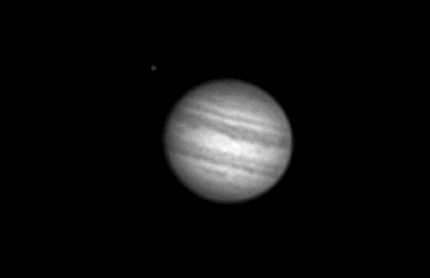 Kuva: Marko Moilanen, Nyrölä Jättiläisplaneetta http://www.ursa.fi/kosmos/j/jupiter.htmlJupiter on ollut taivaalla hyvin havaittavissa loppusyksyn ja kuluneen talven aikana. Planeetan pyörähdysaika on vain noin kymmenen tuntia, joten kaukoputkella seurattuna pyöriminen on havaittavissa hyvinkin lyhyen ajan kuluessa. Jo 5 - 10 minuutissa pyöriminen näkyy selvästi. Yllä oleva animaatio on kooste kahdestakymmenestä kuvasta, jotka otettiin noin kahden ja puolen tunnin aikana ja noin kahdeksan minuutin välein. Mielenkiintoisin yksityiskohta on Ion varjo, joka vaeltaa Jupiterin pinnalla. Ylävasemmalla näkyy Ganymedes, joka häviää Jupiterin varjon taakse. Ion varjosta voi myös päätellä Auringon sijainnin. Säätila kuvaushetkellä oli hyvin huono: Kuu paistoi, ilmakehä oli rauhaton ja yli puolet näistä kuvista on otettu pilvien läpi. Kuvat otettiin Nyrölän tähtitornilla 11.1.2001 kello 18.00 - 20.17 Siriuksen 16-tuumaisella Meade-teleskoopilla ja digitaalisella ST-7E CCD-kameralla. Planeetan kuvaukseen käytettiin fotometrisen BVR-suodatinsarjan punaista suodatinta.