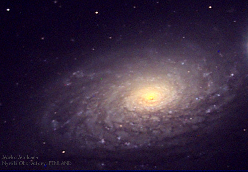 Kuva: Marko Moilanen, Nyrölä Messier 63 on suuri spiraaligalaksi Ajokoirien tähdistössä. Galaksissa on erittäin runsaasti spiraahaaroja, ja se tunnetaan harrastajien keskuudessa myös "Sunflower galaksina" sen hieman auringonkukkaa muistuttavasta ulkonäöstä johtuen. Galaksin etäisyys meistä on noin 30 miljoonaa valovuotta. Kuvauksessa käytettiin LRGB-tekniikkaa, jossa kohde kuvataan kolmen erilaisen värisuodattimen läpi (sininen, vihreä ja punainen) ja myös ilman suodatinta. Tämä mahdollistaa lyhyemmät valotusajat RGB tekniikkaan verrattuna. Tästä huolimatta ylläolevan kuvan kokonaisvalotusaika on yli tunti. Välttämättömien CCD:n korjauskuvien kanssa tähän yhteen kuvaan on vaadittu lähes 50 erillistä valotusta! Myös 8 metrinen Subaru-teleskooppi on kuvannut kohdetta. Tämän japanilaisen jättiläisteleskoopin ottaman kuvan löydät täältä Kuva otettiin Nyrölän tähtitornilla 20.1.2001 Siriuksen 16-tuumaisella Meade-teleskoopilla ja digitaalisella ST-7E CCD-kameralla. Värikuva muodostetiin fotometrisen BVR-suodatinsarjan läpi otetuista sinisestä, vihreästä ja punaisesta valotuksesta.