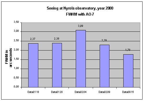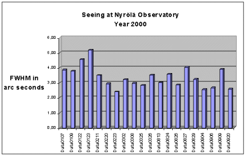 Kaaviokuva: Marko Moilanen Seeing arvoa käytetään mittamaan ilmakehän rauhallisuutta. Maapallon ilmakehä aiheuttaa kuviin häiriöitä, jotka näkyvät valmiissa kuvissa pienten yksityiskohtien katoamisena ja tähtien koon suurentumisena. Haittaa voidaan pienentää sijoittamalla tähtitorni mahdollisimman korkealle, jossa häiritsevää ilmamassaa on mahdollisimman vähän. Tästä syystä lähes kaikki ammattilaisen käyttämät jättiläiskaukoputket sijaitsevat korkeiden vuorten huipuilla. Korkeasta sijainnista ( yli 2000m ) on sekin hyöty, että lähes kaikki pilvet jäävät tähtitornin alapuolelle haittaamasta havaintojen tekoa. Suomessa ei korkeita vuorenhuippuja ole ja täällä ollaankin paikallisen ilmaston armoilla. Ylläoleva kaavio esittää ilmakehän rauhallisuutta Nyrölän observatoriossa vuonna 2000. Kaavioon on koottu mittauksia kaikkiaan 19 eri yöltä. Alla olevat arvot kertovat kuvausyön ja vasemmalla on jokaisen yön kuvasta mitattu tähden koko kaarisekunneissa. Mitä pienempi arvo, sitä rauhallisempi ilmakehä on ollut kyseisenä yönä. Nyrölän keskimääräinen seeing on noin kolme kaarisekuntia. Nyrölässä on käytössä myös aktiiviseen optiikkaan perustuva lisälaite, AO-7 jonka avulla voidaan paikallista seeingiä parantaa jonkin verran. Laitteella on päästy syksyllä 2000 parhaimmillaan jopa alle kahden kaarisekunnin erotuskykyyn. Katso kaavio.