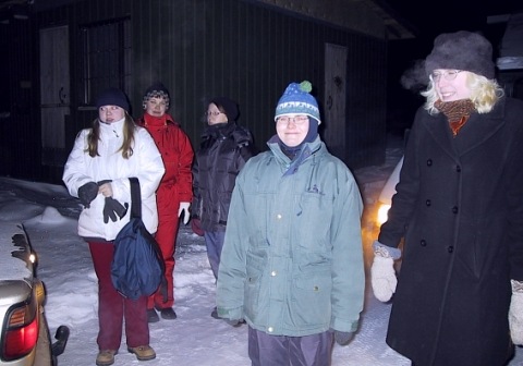 Kuva: Pasi Kankaanpää. Jyväskylän Sirius ry järjesti 5.3. - 11.3.2001 välisenä aikana tähtiharrastusviikon. Tuolloin Nyrölän tähtitornilla oli avoimmet ovet viikon jokaisena selkeänä iltana, jolloin kaikilla oli mahdollisuus päästä tutustumaan Nyrölän laitteistoon. Viikon ohjelmaan kuului myös tutkija Panu Muhlin pitämä esitelmä tähtien elämästä, joka järjestettiin tiistaina 6.3.2001 Jyväskylän yliopistossa. Tämä harrastusviikko oli säiden suhteen hieman parempi kuin viime tammikuussa järjestetty, ja maanantai- ja keskiviikkoiltoina sää oli selkeä. Tuolloin noin kaksisataa uteliasta kävi tutustumassa Nyrölän laitteistoon, ja heille näytettiin taivaalla nyt hyvin näkyviä planeettoja: Venusta, Jupiteria, Saturnusta. Myös Kuuta katseltiin pihaan pystytetyllä pienemmällä putkella, samoin kuin joitakin kirkkaimpia tähtijoukkoja. Ylläolevassa kuvassa Nyrölässä on vierailulla biologian opiskelijoita Jyväskylän yliopistosta. Taustalla näkyy uusi huoltarakennus ja yläoikealla hieman tähtitornista. Yksityiskohtaisen kertomuksen heidän matkastaan löytyy Syrinxin tähtitorniretki Nyrölään -sivulta.