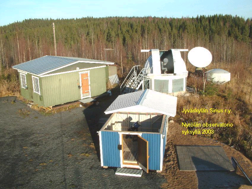 Kun kelit ovat mitä ovat, viikonkuva osiossamme on ollut varsin hiljaista. Ohessa on Riston ja Kyöstin ottama kuva Siriuksen Nyrölä observatorio alueesta. Kuvassa vasemmalta oikealle näkyvät takarivissä huoltorakennus, tähtitorni (+16" Meade), radioteleskooppi ja toinen 3m lautasantenni. Eturivissä, toinen tähtitorni (+10" Meade)ja havaintoalusta kaukoputkia/kameroita/kiikareita varten. |