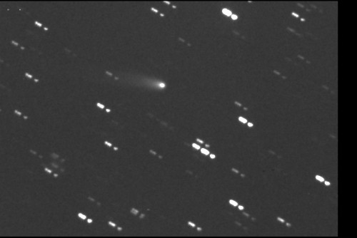 Heinäkuun lopussa sen pitäisi kirkastua niin, että sen voi nähdä jopa paljain silmin. Kaukoputki on seurannut komeettaa usean valotuksen ajan ja tästä johtuen tähdet ovat venyneet viiruiksi.