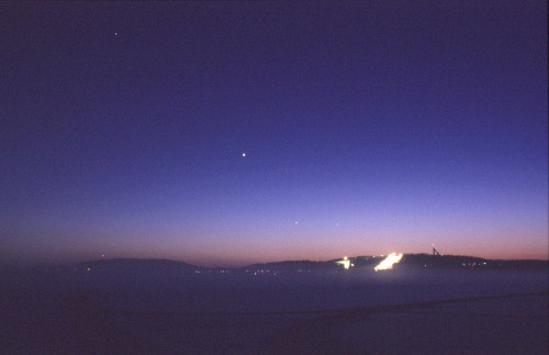 Kuva Aki Id Maaliskuussa 1999 iltataivaalla oli havaittavissa peräti neljä planeettaa. Yllä olevassa kuvassa on näkyvissä (vasemmalta oikealle) Saturnus, Venus, Jupiter ja Merkurius. Kuva on otettu Jyväskylässä Tuomiojärven rannalta, taustalla näkyy Laajavuoren laskettelukeskuksen valot ja hyppyrimäki.