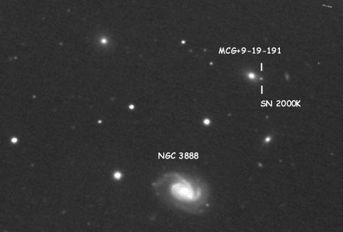 Nyrölän tähtitornilla on nyt kevättalvella havaittu lisää supernovia. Yllä olevassa kuvassa on supernova 2000K galaksissa MCG+9-19-191. Supernovan löysi 28.2.2000 Tom Puckett.