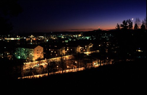 Jyväskylän kaupunki iltahämärissä keväällä 1999. Kuvan oikeassa laidassa laskeva Kuunsirppi, taustalla näkyy myös Harjun vesitorni. Kuva otettiin taulumäen päältä. Aikaisempien viikkojen kuvia